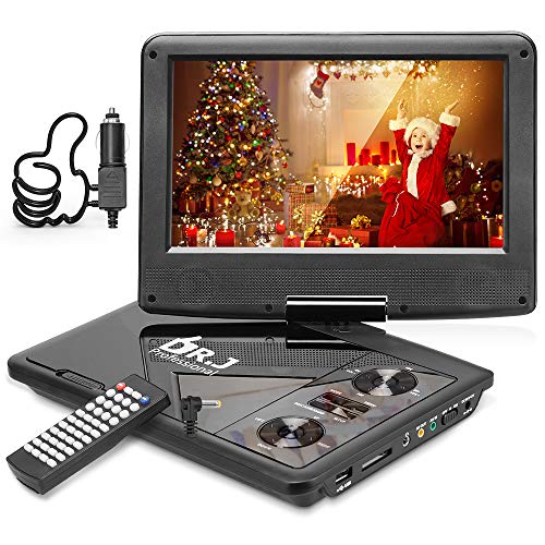 This portable DVD player is equipped with 9.5 Inch swivel screen and is as light as 2.95 pounds. It's designed and manufactured by our professional team, qualified with the advanced manufacturing process, and the raw material promises top quality and superior product performance. This portable DVD player is a perfect gift for anyone, especially for a long road trip. Main Features of This Portable DVD Player: 1. 3000mAh high-capacity rechargeable battery guarantees you at most 5 hours of playing your favorite movies on-the-go. 2. The included 1.8m AC adapter and car charger make it impossible to happen that the battery runs out in a short time. 3. The anti-shock feature ensures you stable and smooth viewing experience even traveling on a rough road surface. 4. The 9.5 Inch HD swivel TFT screen together with its 270-degree rotation and 180-degree flip feature allows extreme viewing experience and easy positioning. 5. Besides the professional 24-hour after-sales services, we also provide a 30-day money back guarantee and 24-month warranty with a replacement or a refund to free you from any hassles of quality issue. Multiple Multimedia Formats Supported: Disc Format: CD, DVD, DVD + R (-R), DVD + RW (-RW), VCD, SVCD-R (RW), CD-R (RW). Supports MP3, MPG, VOB, AVI, DIVX, MPEG and RMVB (maximum resolution 720*576, and for RMVB 720P), JPG and TXT. (Supports discs of all region.) Supports USB, SD and MMC card, up to 32G. AV cable is in the packaging, connect to other devices like TV, Projector etc. To connect with another DVD Player, you need additional AV to AV cable. Package Contents: 1x Portable DVD Player 1x Remote Control 1x Car Adapter 1x AV Adapter 1x AV Cable 1x User Manual